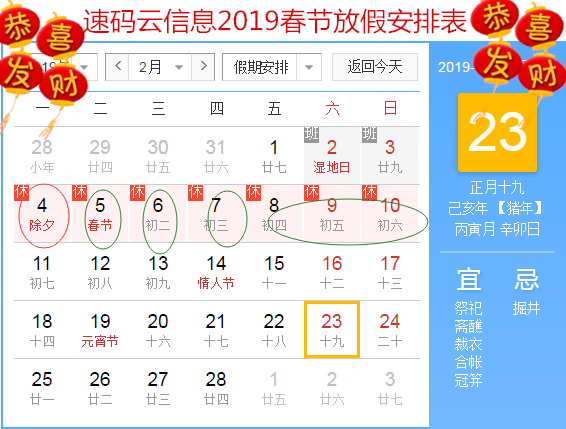 2018年农历即将过完,2019年春节马上来到,一年一度的春节是格外的隆重,是远在外地的游子回家团聚的时刻,是亲朋好友把酒言欢的日子,为了让大家过上一个时间富余,家人欢庆,吉祥如意且意义非同寻常的春节,公司决定所有员工(包括群发短信处理客服部)短信平台销售部、短信系统技术部、短信财务部、今年春节放假7天,具体放假时间如下: